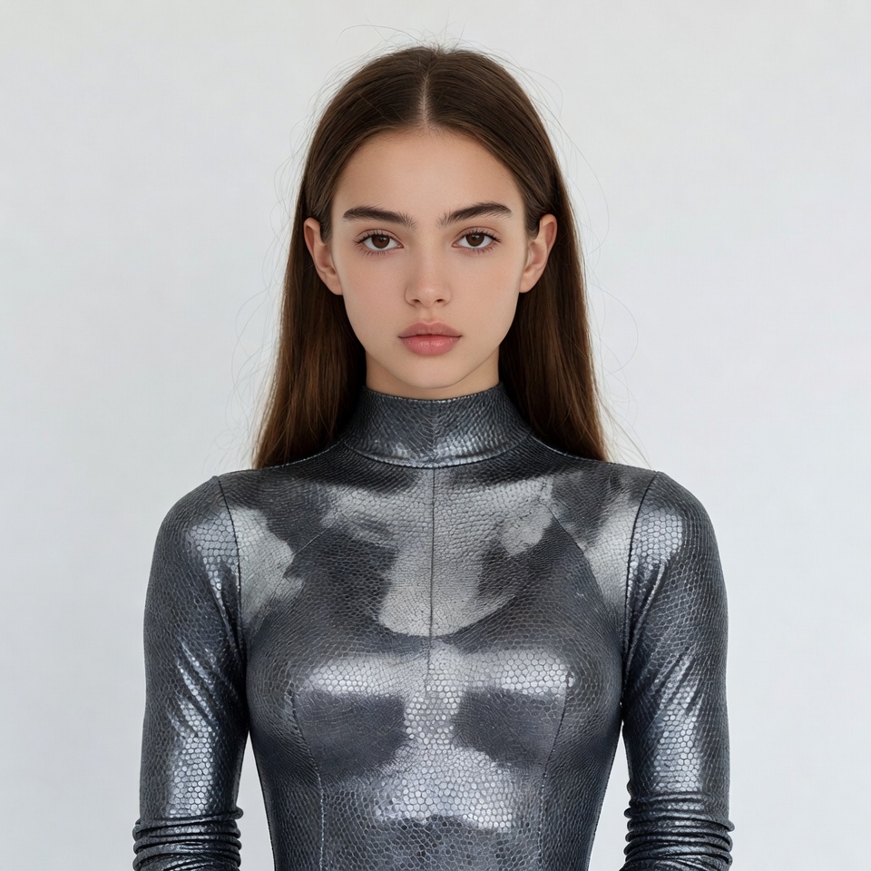 A young woman with long straight brown hair stands against a white background. She wears a form-fitting silver metallic turtleneck top with a textured snakeskin pattern. Her expression is neutral with subtle makeup and direct gaze at the camera.