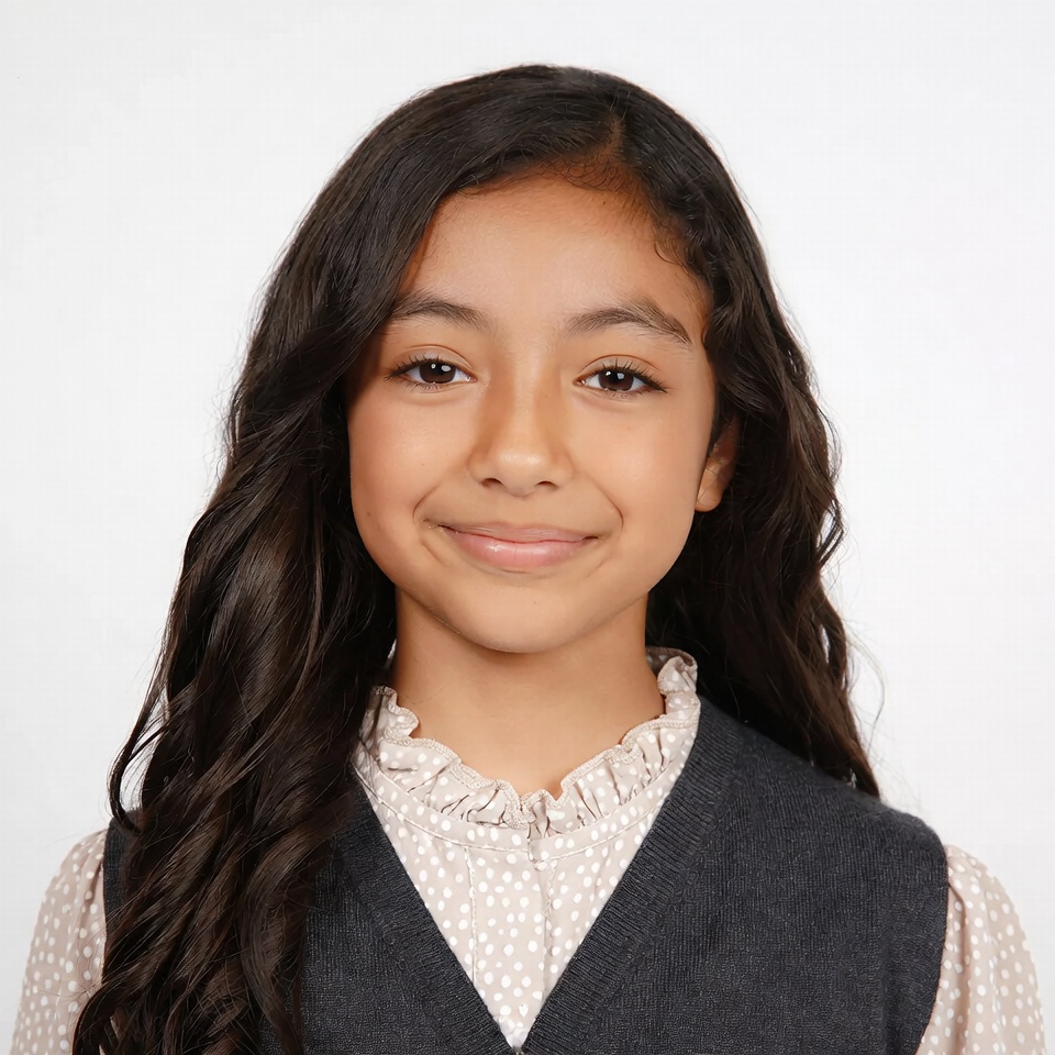 A young girl with long dark wavy hair smiles at the camera against a white background. She wears a gray vest over a collared blouse with polka dots. Her brown eyes are expressive and she has a friendly expression.