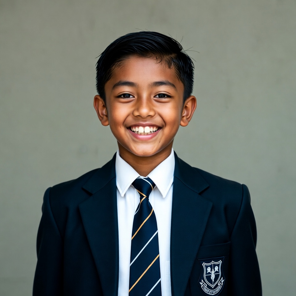 A young Asian boy with short black hair smiles brightly at the camera. He wears a navy blue school uniform jacket with a white shirt, striped tie, and school badge on the pocket. He stands against a plain gray background.
