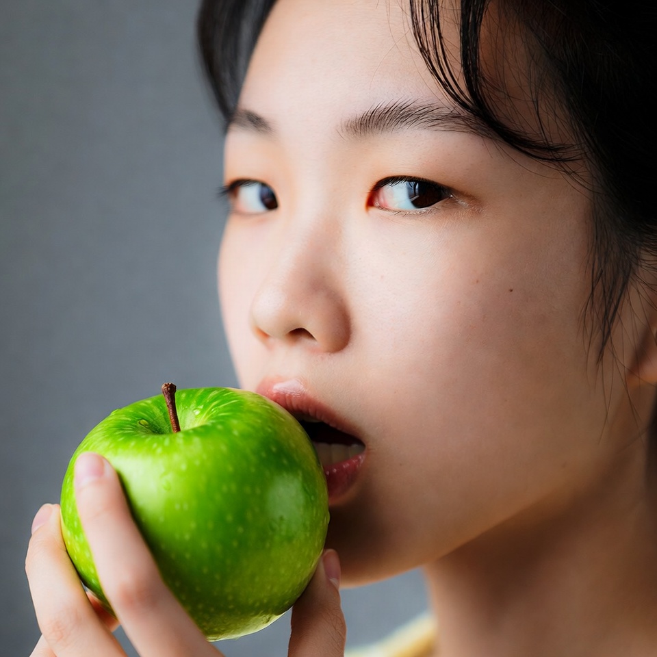 A young Asian woman with long black hair holds a fresh green apple to her mouth and takes a bite. She gazes sideways with focused eyes against a plain gray background. Her lips are slightly parted around the apple's stem.