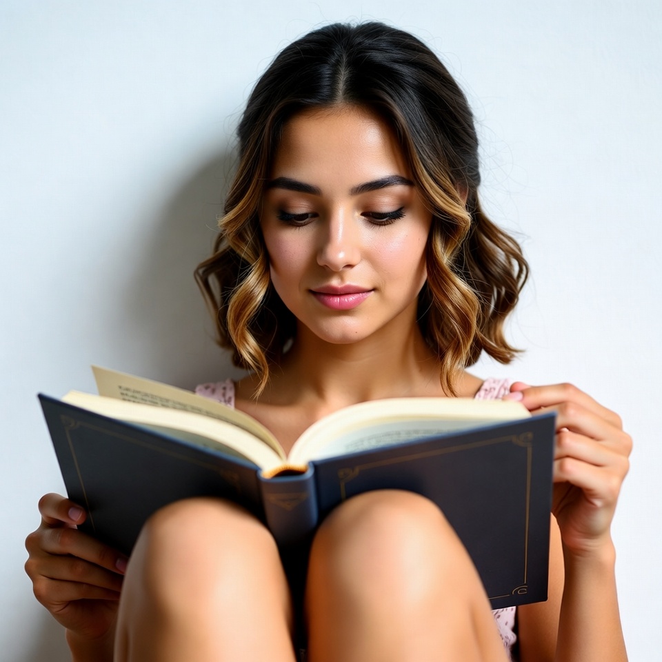 A young woman with wavy dark brown hair highlighted with blonde sits on the floor against a white background, intently reading an open hardcover book. She wears a light pink top and holds the book with both hands while sitting with knees drawn up. Her focused expression highlights her almond-shaped eyes and subtle makeup.