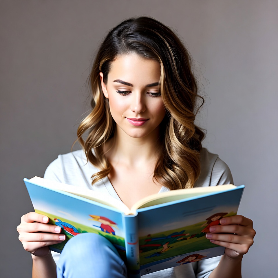 A young woman with long wavy brown hair sits holding an open colorful children's book with illustrations of kids and animals. She wears a light gray v-neck top and blue jeans, focusing intently on the pages. The image is set against a plain light gray background.