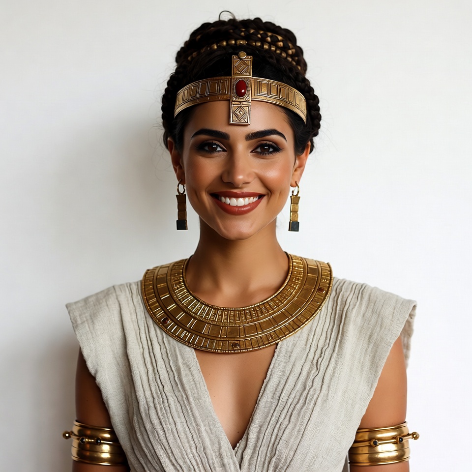 Cleopatra, Egyptian costume, Middle Eastern, ancient Egypt, arm cuffs, braided hair, collar necklace, gold headdress, gold jewelry, hoop earrings, isolated background, linen dress, off-shoulder, pharaoh attire, portrait, regal woman, smiling, updo, white gown, woman