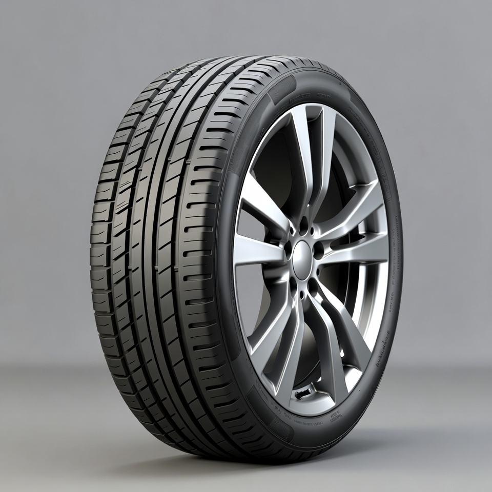 A high-quality black car tire is mounted on a shiny silver alloy wheel. The tire features detailed tread patterns and a white lettering sidewall. The wheel is centered against a plain gray background.