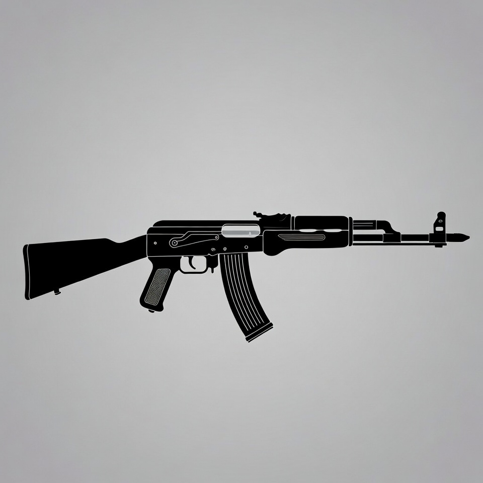 A black silhouette illustration of an AK-47 assault rifle is centered on a solid gray background. The rifle features a curved magazine, wooden stock, and distinctive gas tube. It is depicted in a side profile view with clean, bold outlines.