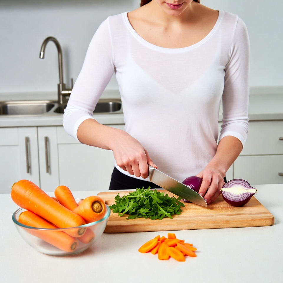 A woman with long brown hair stands at a kitchen counter, chopping an onion and fresh greens with a large knife on a wooden cutting board. Bunches of orange carrots sit in a glass bowl nearby, with sliced carrot pieces scattered around. She wears a sheer white long-sleeve top and black pants in a modern kitchen with stainless steel sink and white cabinets.