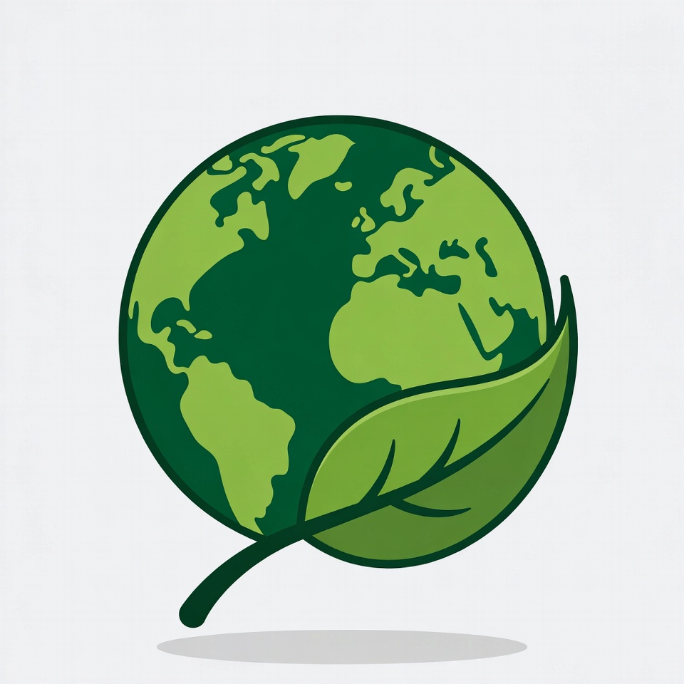 A vibrant green illustration of Earth with a large green leaf extending from its side. The planet features detailed green continents on a darker green background, set against a white isolated backdrop. The design emphasizes environmental themes through its simple vector style.