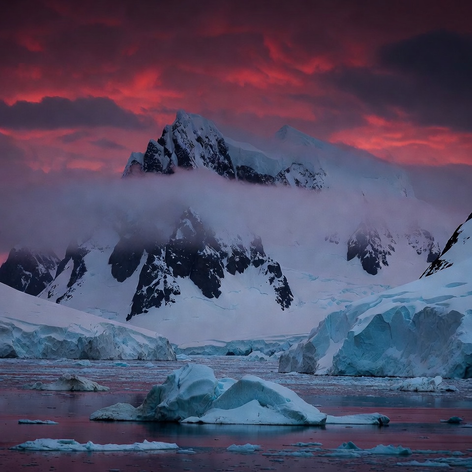 aurora-like sky, cold climate, crimson clouds, dramatic sky, expedition view, frozen scenery, glacial ice, glacier, icebergs, icy water, jagged rocks, mist, mountains, nature, polar landscape, red sunset, remote peaks, snowy peaks, wilderness, Antarctica