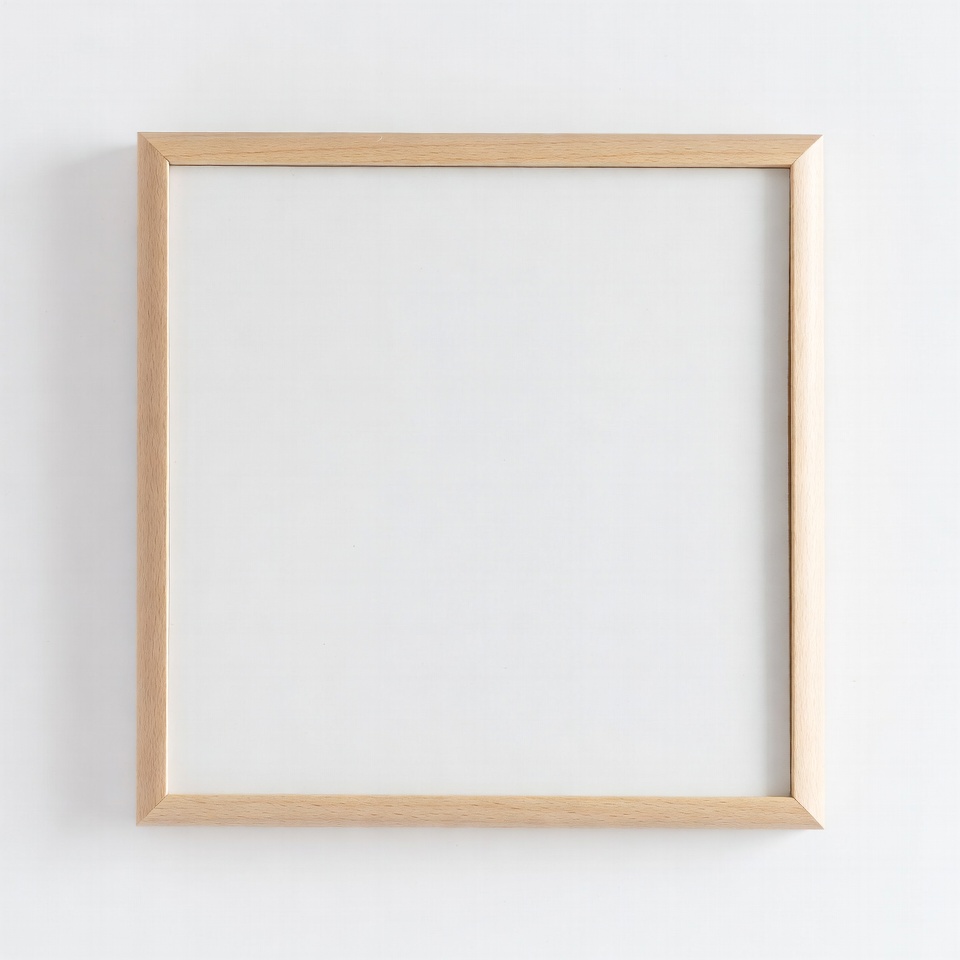 A square wooden picture frame with a light golden finish hangs on a plain white wall. The frame has a simple, elegant design with clean lines and a white mat inside. The center displays a completely empty white space.