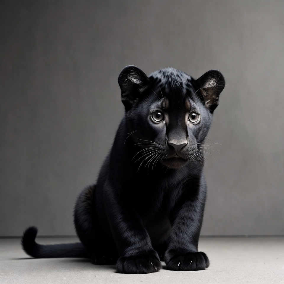 A young black panther cub sits on a dark gray surface with a matching gradient background. The cub has glossy black fur, large expressive eyes, and perked ears. Its paws are positioned forward, and its tail curls behind it.
