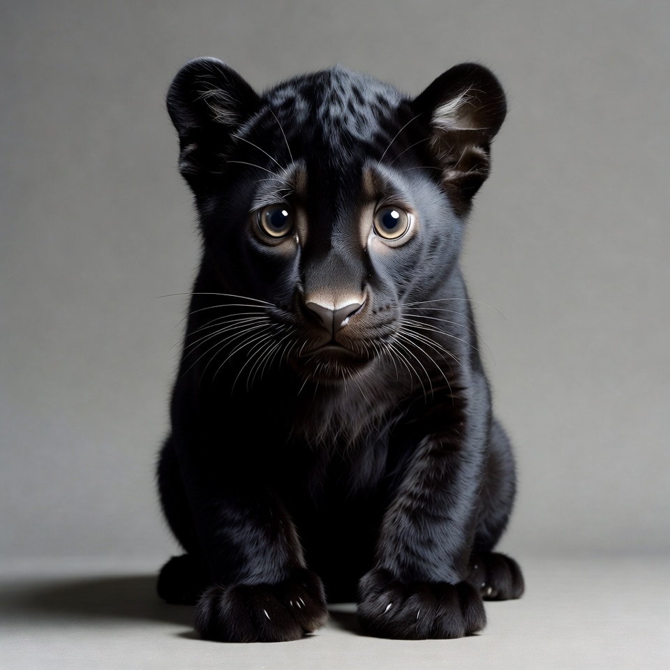 animal, baby panther, big cat, black panther, cute cub, feline, glossy fur, golden eyes, gray background, isolated, kitten, paws, rosettes, sitting, wild cat, wildlife, panther cub