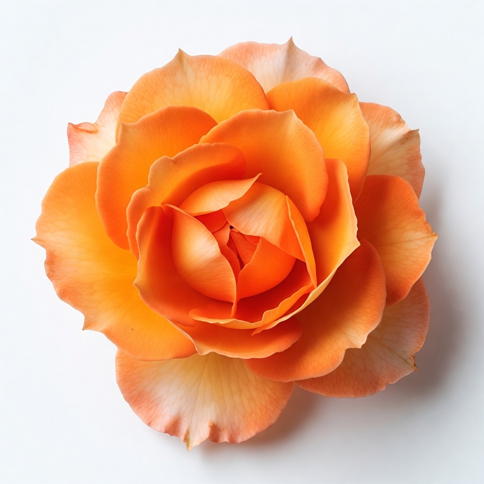 A vibrant orange rose with layered petals is centered against a plain white background. The flower displays rich apricot hues and soft edges on its fully bloomed petals. It is photographed from a top-down angle, highlighting its intricate details.