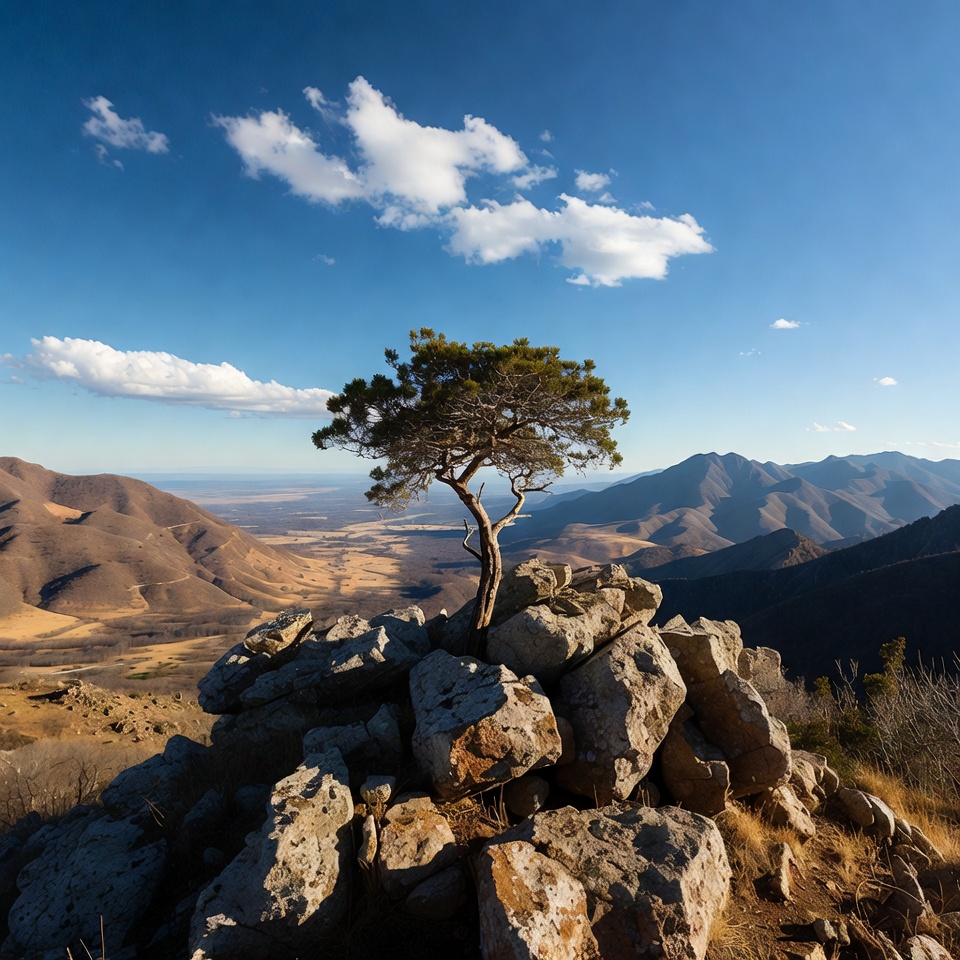 A single pine tree grows atop a rocky outcrop overlooking a vast valley. Surrounding mountains stretch into the distance under a clear blue sky with scattered white clouds. The landscape features arid hills, dry grasslands, and distant plains.