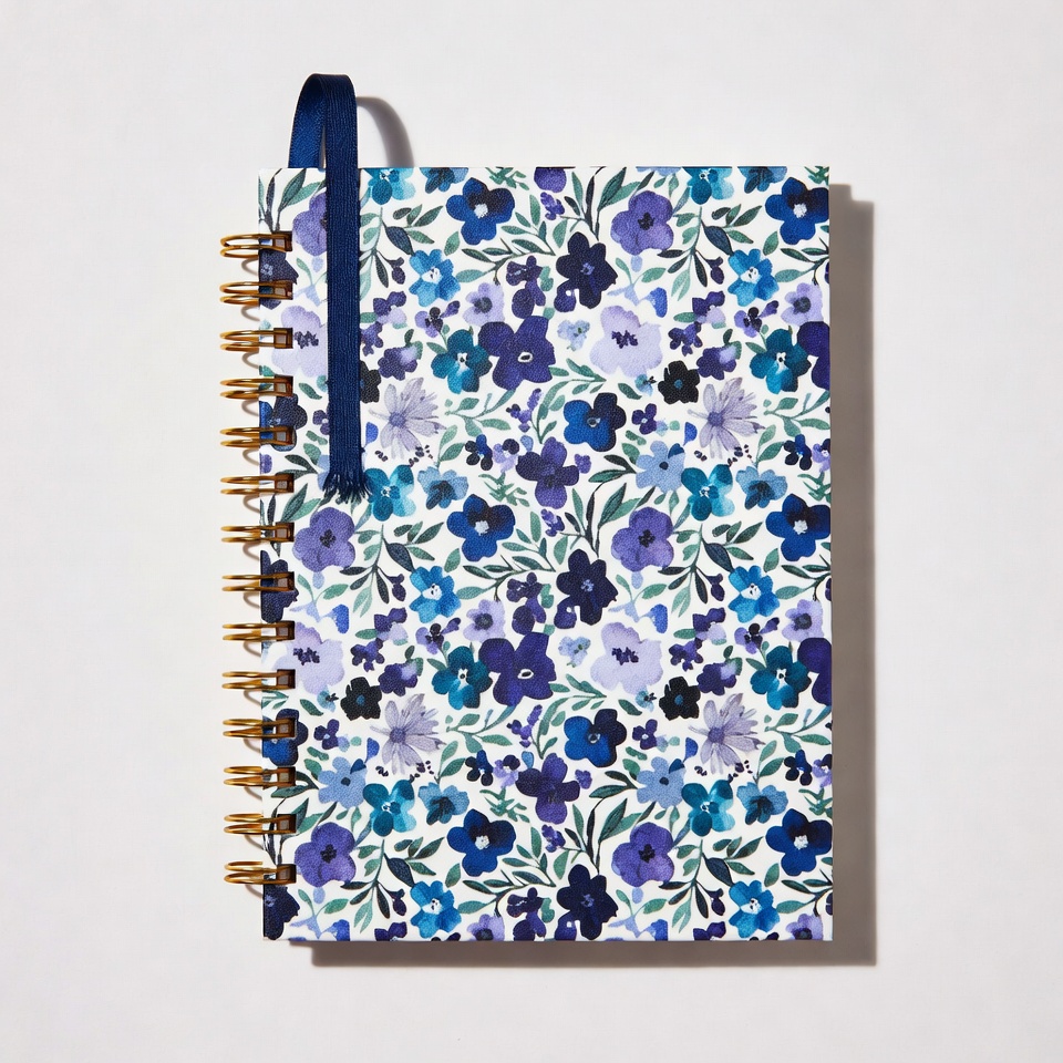 blue flowers, floral notebook, floral pattern, isolated background, journal, office supplies, purple flowers, purple notebook, ribbon bookmark, spiral bound, stationery, watercolor flowers, white flowers, writing journal, notebook