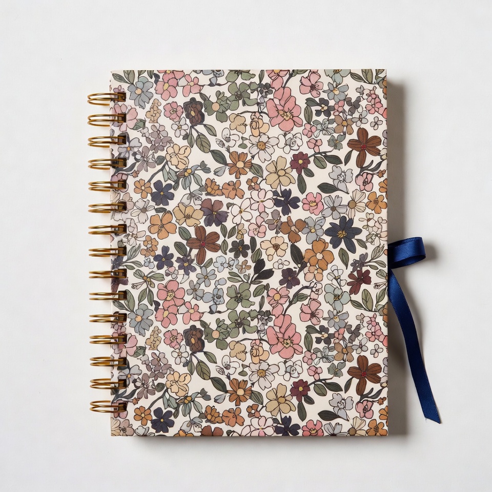 blue ribbon, brown flowers, colorful cover, diary, floral notebook, floral pattern, flower design, flowers, gold spiral, green flowers, isolated background, journal, pink flowers, purple flowers, spiral notebook, stationery, white background, notebook