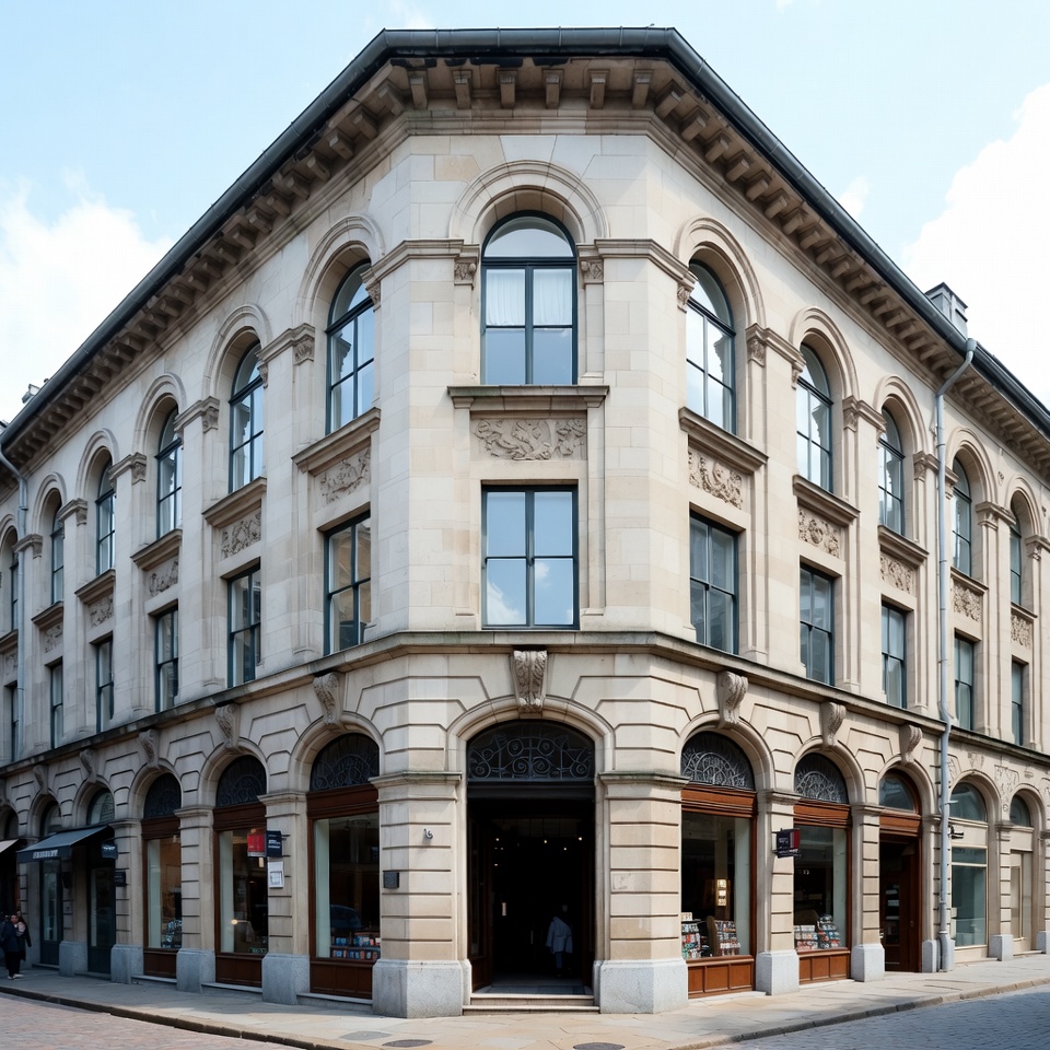 arched windows, beige stone, city architecture, cloudy sky, cobblestone street, commercial building, corner view, european building, glass windows, historic architecture, old building, ornate carvings, pedestrians, stone facade, storefronts, street scene, urban street, wooden doors, corner building