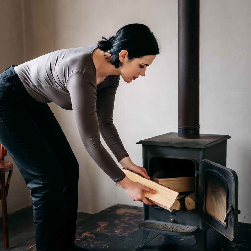 A woman with black hair in a bun bends over to place firewood into an open cast iron stove. She wears a gray long-sleeve top and black pants while standing on a wooden floor near a white wall. A wooden chair is visible in the background.