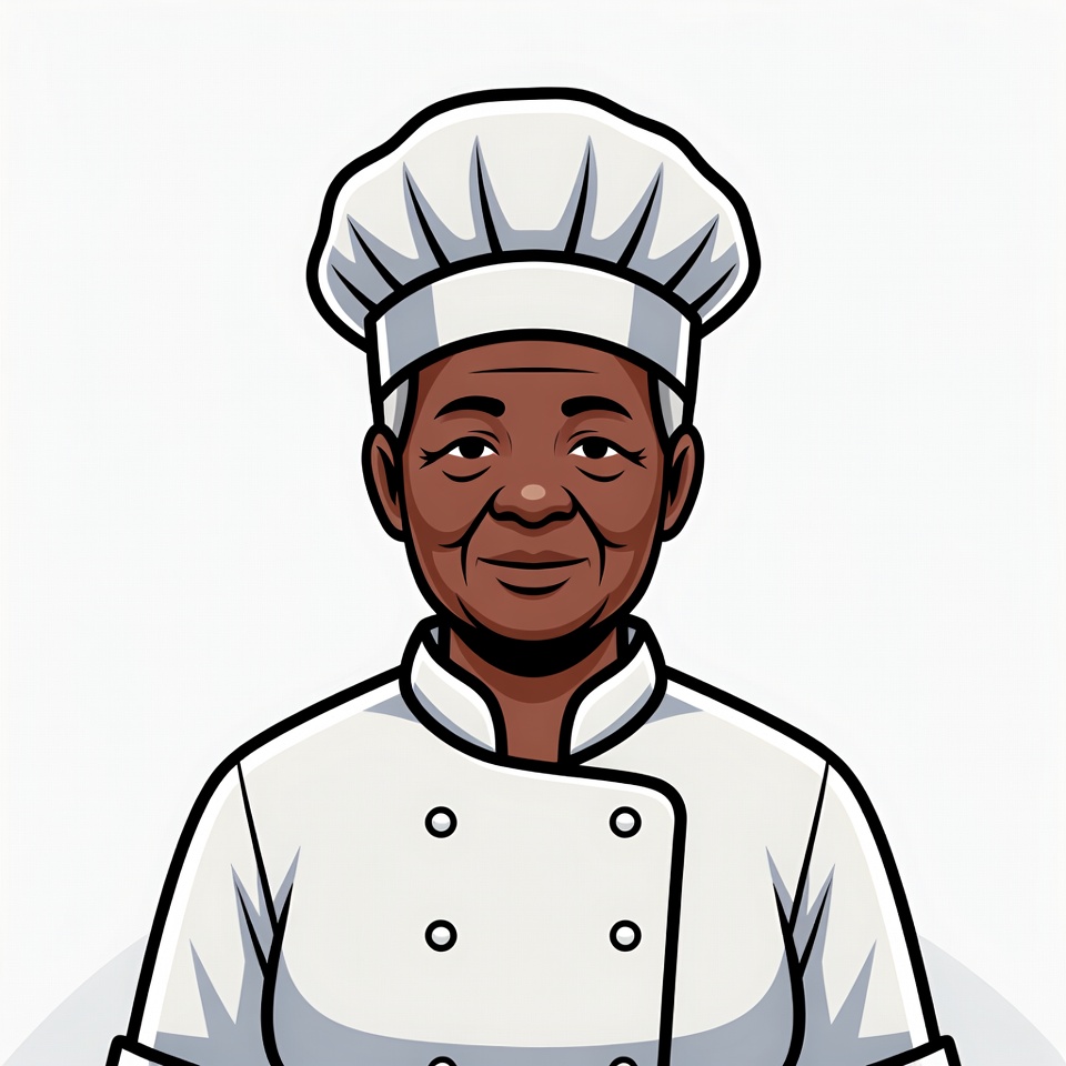 A cartoon illustration of an elderly African-American woman wearing a tall white chef's hat and double-breasted white chef's jacket. She faces forward with a gentle smile on a plain white isolated background. The vector art features bold black outlines and simple shading.