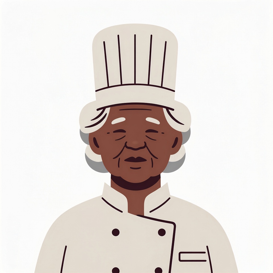 A cartoon illustration of an elderly African-American woman wearing a tall white chef's toque and a white chef's jacket with black buttons. She has short white hair, glasses, and a gentle smile. The figure is centered on a plain white background.