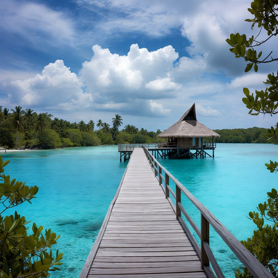 Maldives, Polynesia, beach, blue sky, bungalow, clear water, clouds, dock, greenery, island, lagoon, ocean, palm trees, paradise, resort, sea, stilt house, thatched roof, tropical foliage, tropical hut, turquoise water, vacation, waterfront, white sand, wooden pier, overwater bungalow
