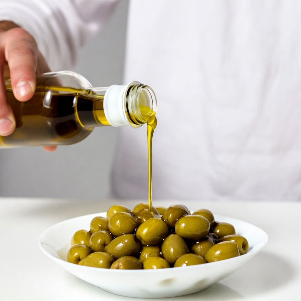 Chef pouring oil on olives
