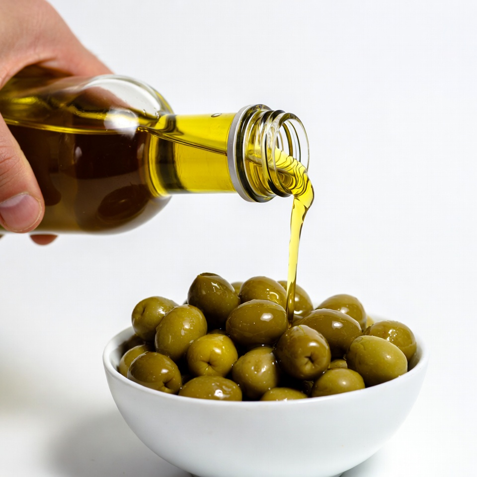 A hand holds a bottle and pours golden olive oil into a white bowl filled with green olives. The oil streams down onto the olives, coating them lightly. The scene is set against a plain white background.