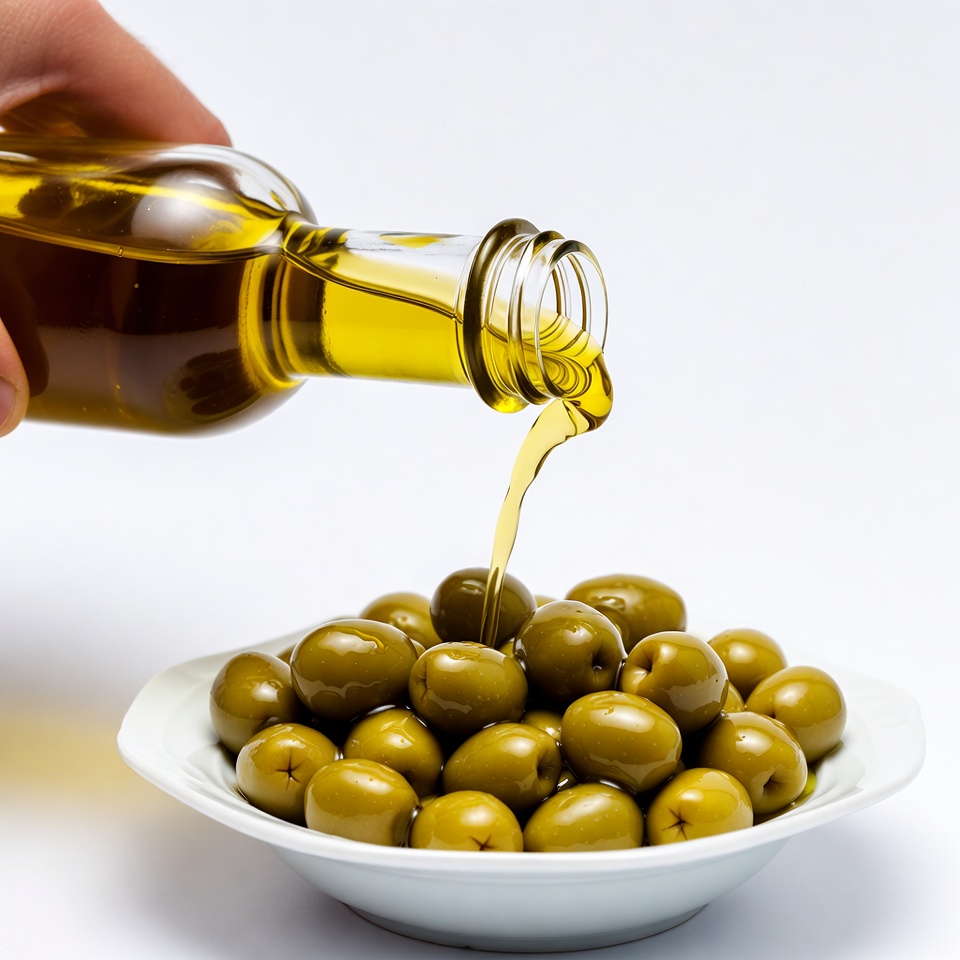 A hand holds a glass bottle and pours golden olive oil over a white bowl filled with green olives. The oil streams down onto the pile of olives below. The scene is set against a plain white background.