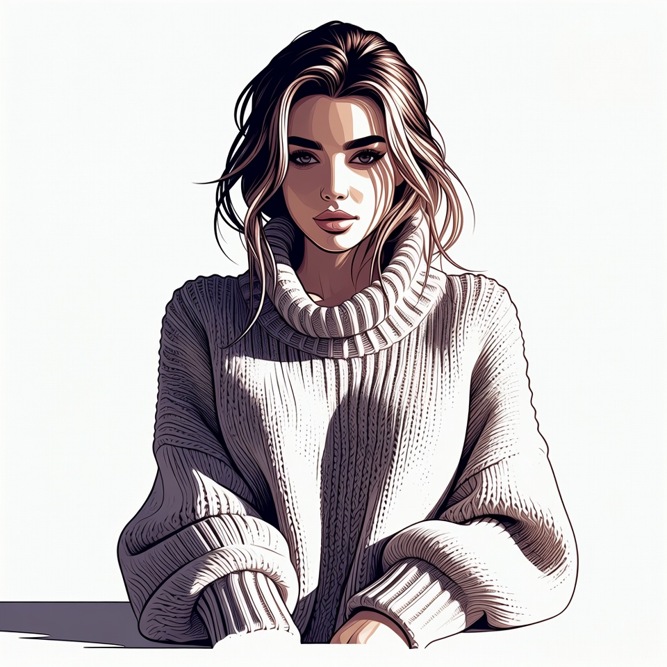 A young woman with wavy brown hair and striking features gazes forward. She wears a cozy white turtleneck sweater with oversized sleeves. The digital illustration is set against an isolated white background with soft lighting.