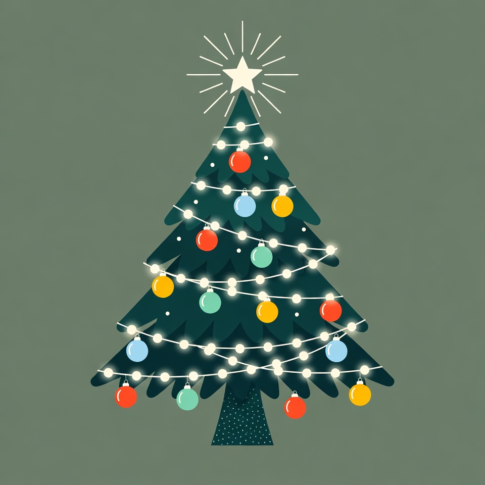A vibrant illustrated Christmas tree stands on a solid green background. It is adorned with colorful ornaments in red, blue, yellow, and green, and wrapped in white string lights. A glowing star tops the tree.