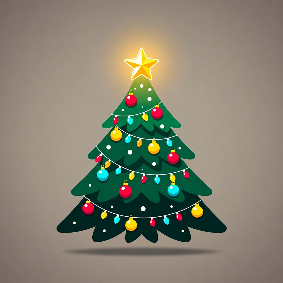 A vibrant illustrated Christmas tree stands on a beige background with a glowing golden star at the top. It is decorated with colorful ornaments in red, green, blue, and gold, along with strings of lights. The tree has a simple cartoon style with white snow accents on its branches.