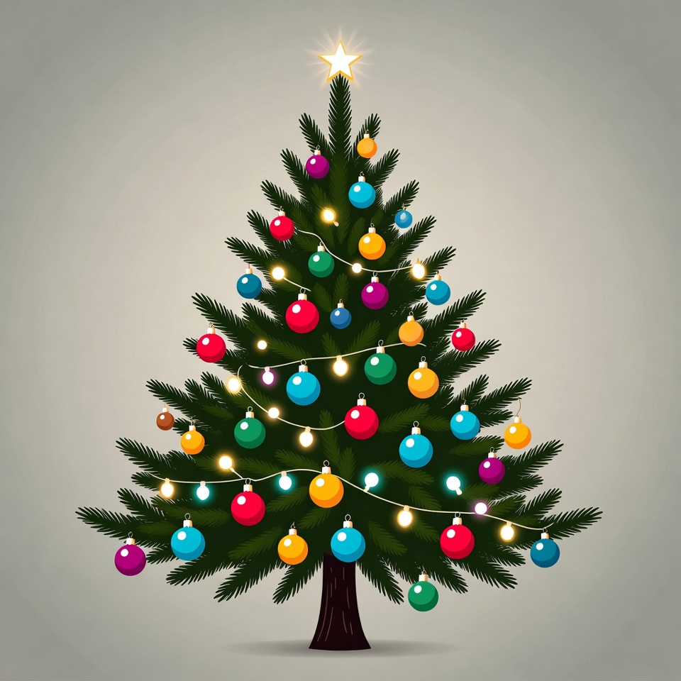 A vibrant illustrated Christmas tree stands on a gray background. It is decorated with multicolored ornaments, string lights, and a glowing star on top. The tree has a dark green fir shape with branches covered in blue, red, yellow, and green balls.