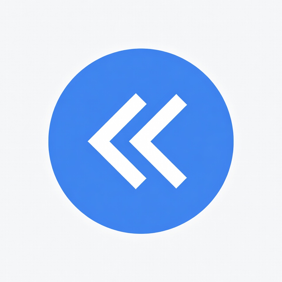 A simple blue circular button features a white double left arrow icon pointing backwards. The arrow is centered within the solid blue circle. The design is clean and minimalistic on a transparent background.