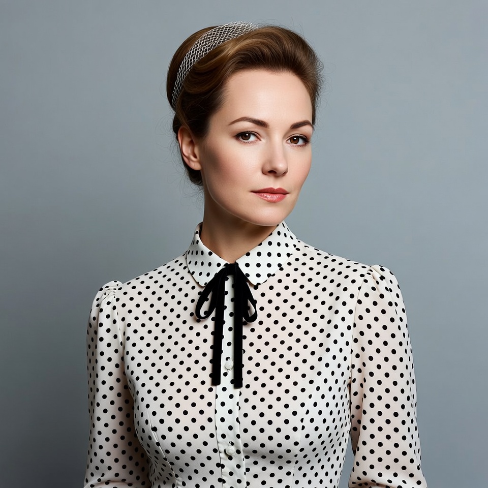 A woman with brunette hair styled in an elegant updo wears a sparkling headband. She has a neutral expression and gazes forward against a plain gray background. She is dressed in a sheer white blouse covered in black polka dots with puffed sleeves and a black bow tie at the collar.