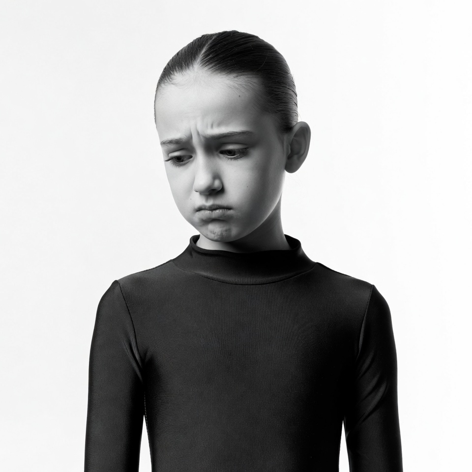 A young girl with long dark hair in a bun stands against a white background. She wears a black turtleneck and long-sleeve top. Her face shows a sad, pouting expression with furrowed brows and downturned mouth.