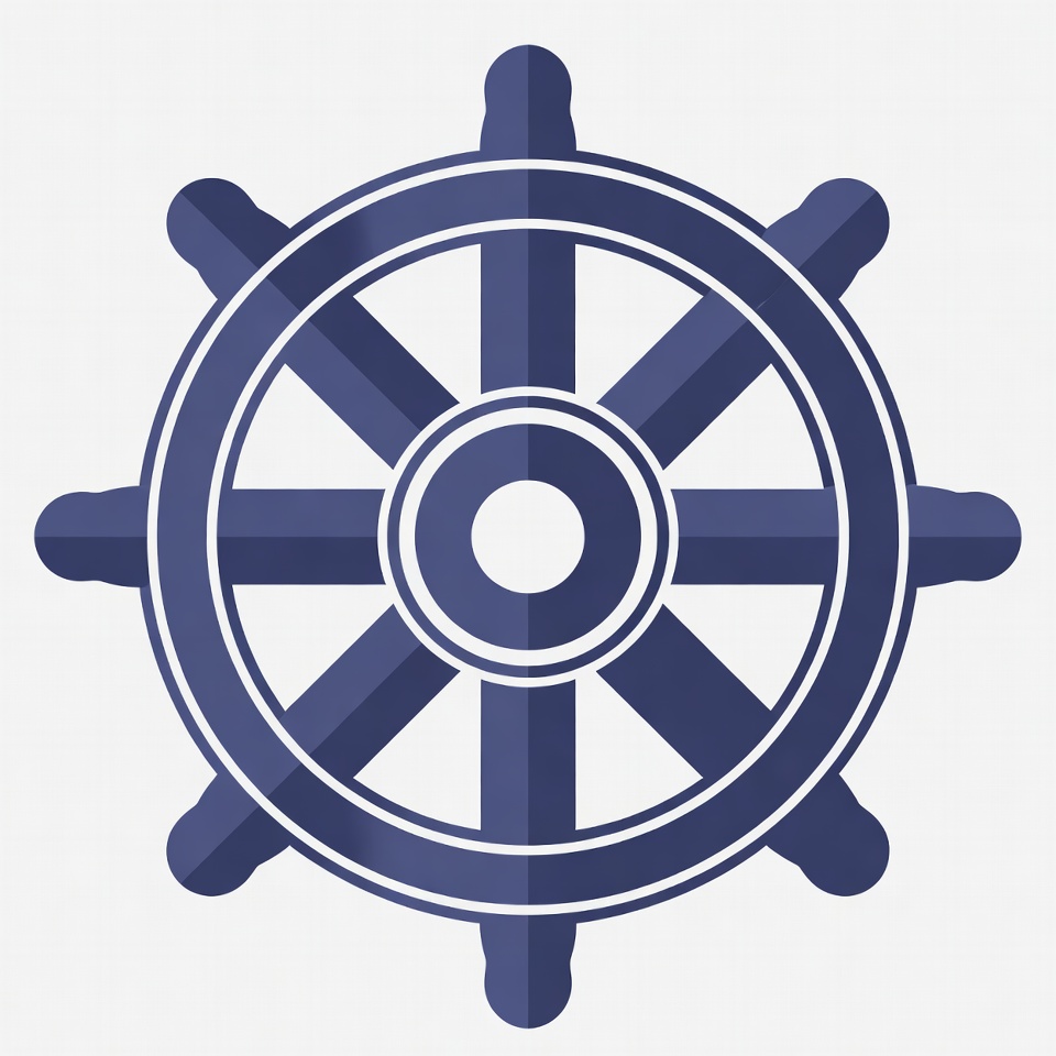 A simple blue flat illustration of a ship's steering wheel with eight spokes and a central hub. The design features clean lines and is set against a white background. It has a nautical theme with rounded handles on the spokes.