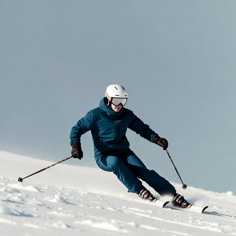 A man in a blue ski suit and white helmet skis down a snowy mountain slope. He wears goggles and brown gloves while holding ski poles. Snow sprays up from his skis as he turns on the bright winter day.