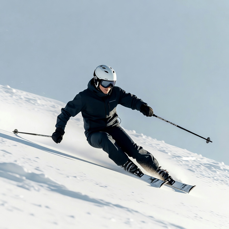 A man in a dark jacket and pants skis down a snowy mountain slope. He wears a white helmet, goggles, and black gloves while holding ski poles. White skis are attached to his boots as he glides on the snow.