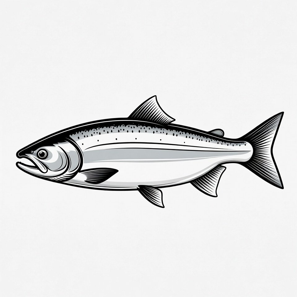 animal, clipart, detailed drawing, fins, fish, freshwater fish, graphic, illustration, isolated background, monochrome, ocean fish, scales, seafood, side view, spots, swimming fish, vector, wildlife, salmon