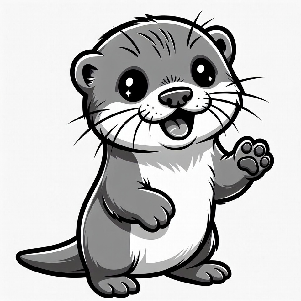 adorable, animal illustration, baby otter, big eyes, cartoon otter, chibi, clipart, cute otter, furry animal, gray otter, happy animal, isolated background, kawaii, paw raised, playful otter, sketch style, smiling otter, vector art, waving otter, white belly, otter