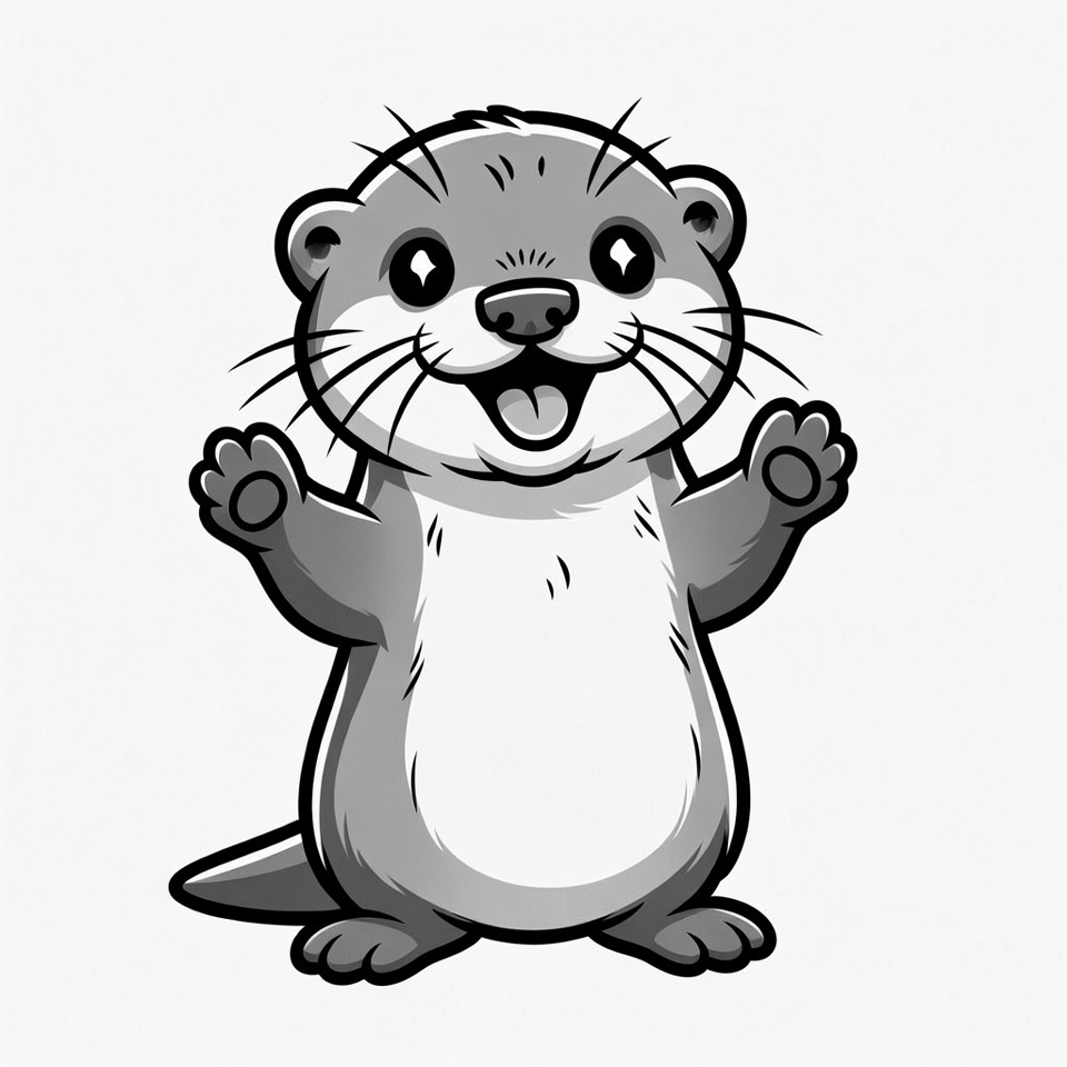 A cute cartoon otter stands on a white background with paws raised in a waving gesture. It has big sparkling eyes, a wide smiling mouth, and glossy gray fur. The illustration features a fluffy tail and detailed whiskers.