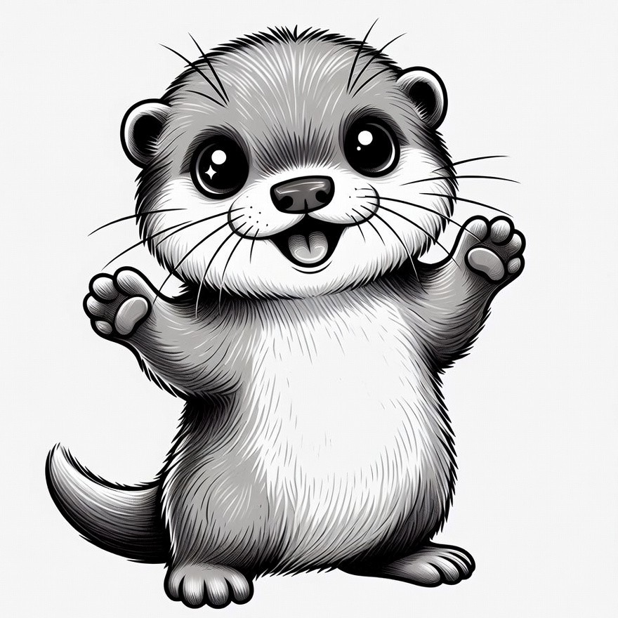 adorable animal, animal illustration, baby otter, big eyes, black and white, cartoon otter, clipart, cute otter, fluffy fur, happy otter, isolated background, kawaii otter, line art, otter illustration, playful otter, smiling otter, waving paws, otter