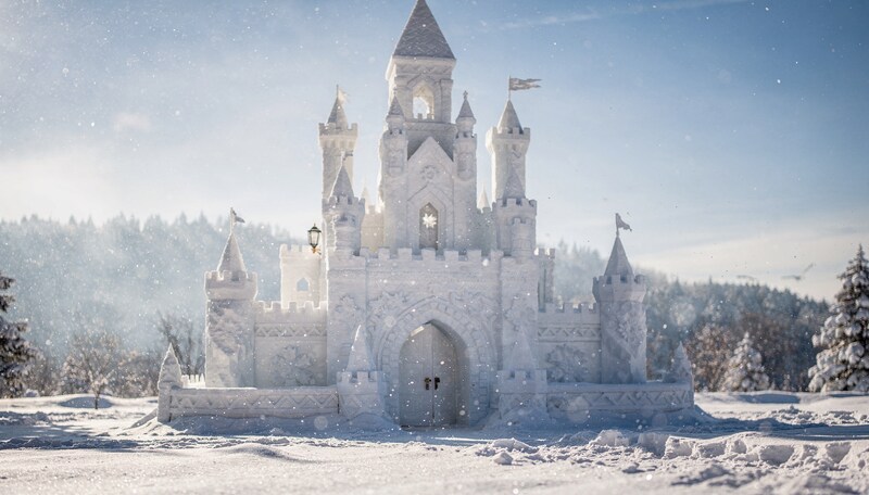 artistic, blue sky, castle, flags, frozen, ice sculpture, lanterns, mountains, outdoor, pine trees, sculpture, snow, snow festival, snow sculpture, snowy landscape, towers, white, winter, snow castle
