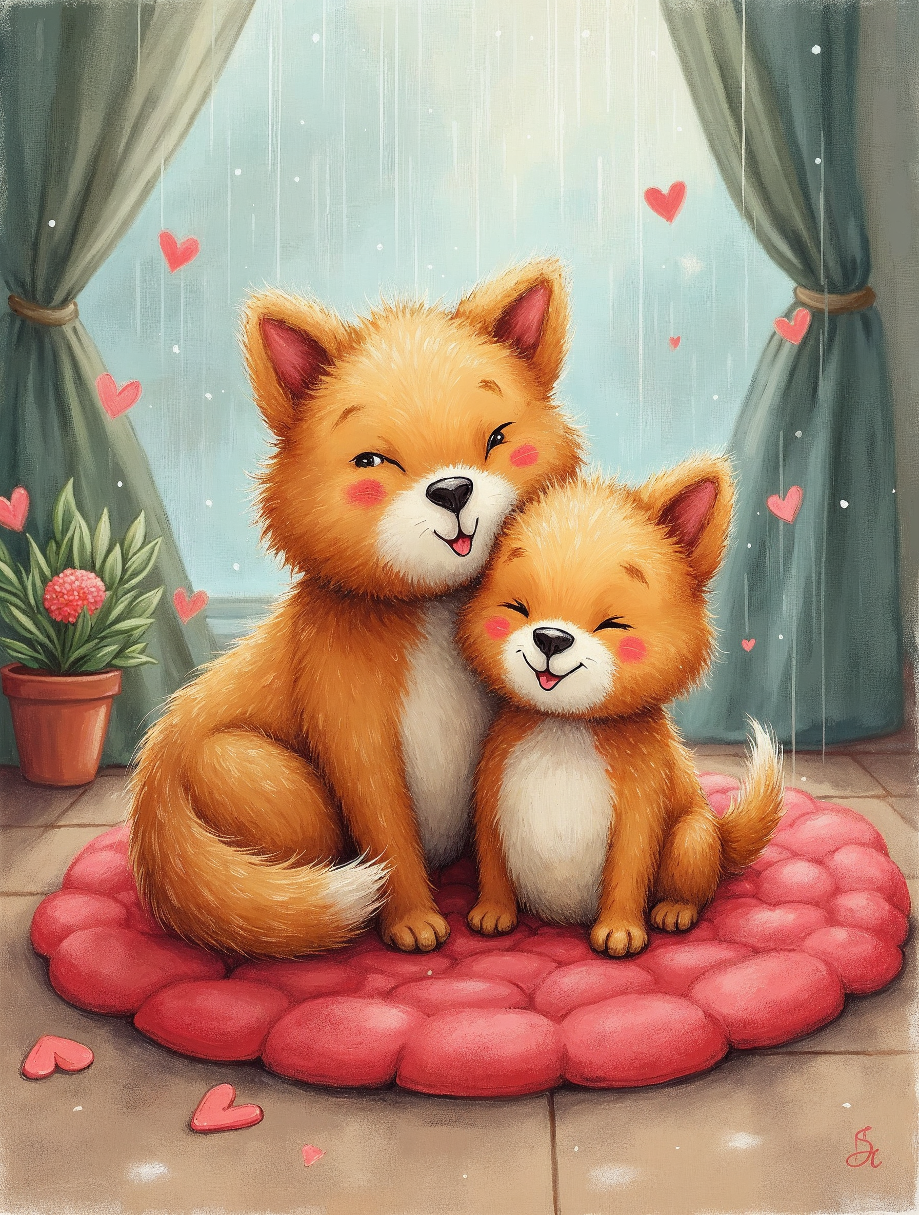 adorable animals, animal love, animals, cartoon animals, cozy room, cuddling foxes, cute fox, digital art, floating hearts, fluffy fox, fox couple, fox pups, foxes, heart rain, hugging foxes, illustration, kawaii fox, orange fox, pink hearts, potted plant, rainy window, red rug, sheer curtains, window view, fox