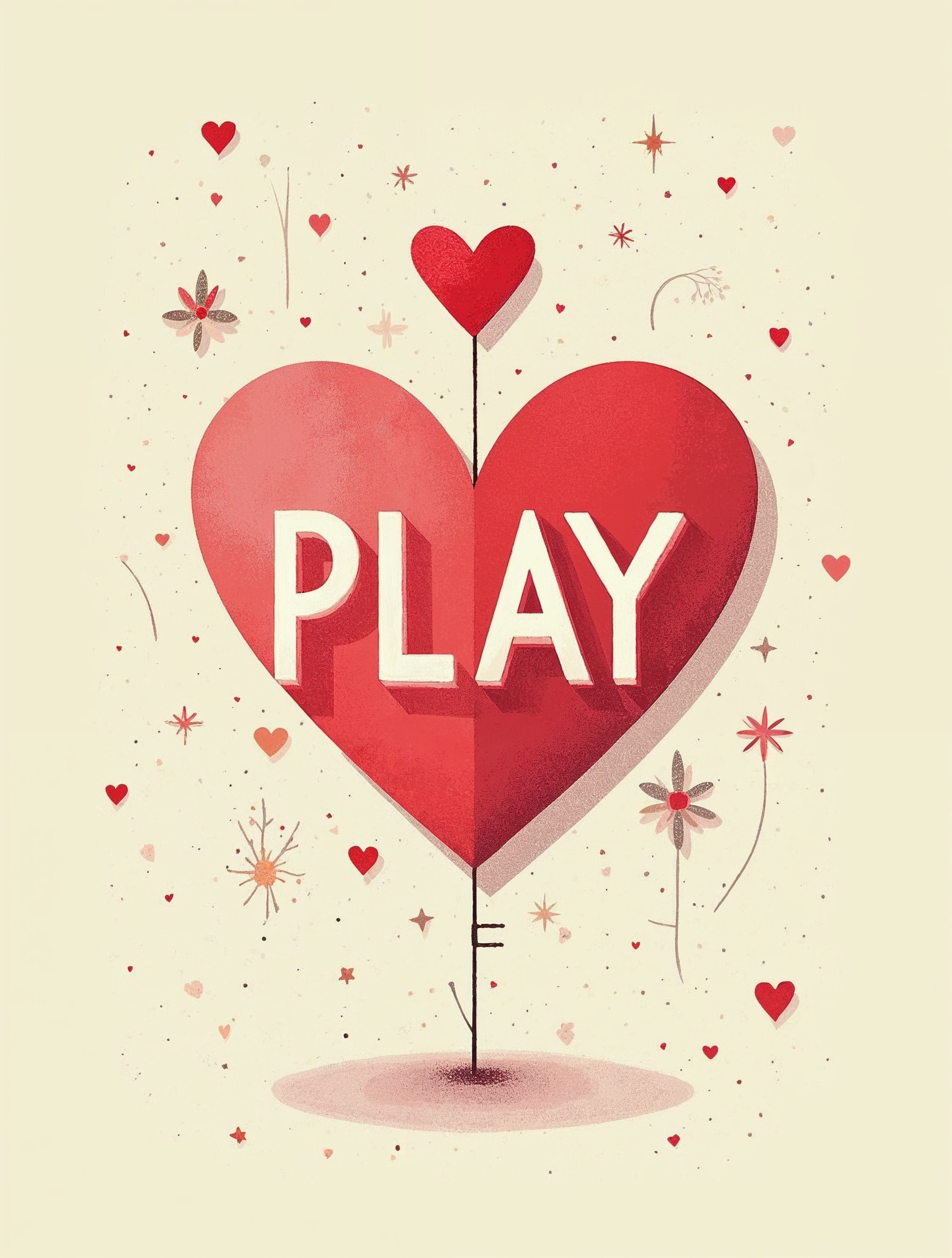 A large red heart stands on a thin stem with the bold white text 'PLAY' across it. Surrounding the heart are scattered smaller red hearts, pink stars, and simple floral elements on a light beige background. The design features a watercolor style with soft shadows.