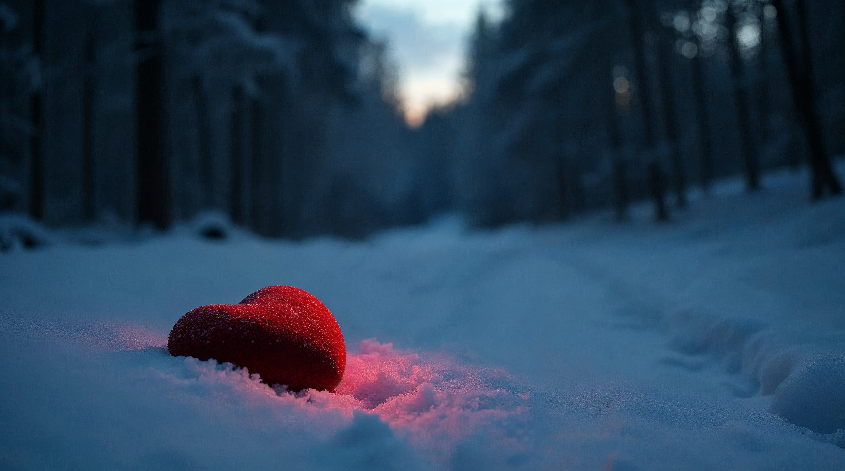 A vibrant red heart lies partially buried in fresh snow on a forest path. Tall pine trees covered in snow line both sides of the path under a twilight sky. The heart glows softly against the blue-toned winter landscape.