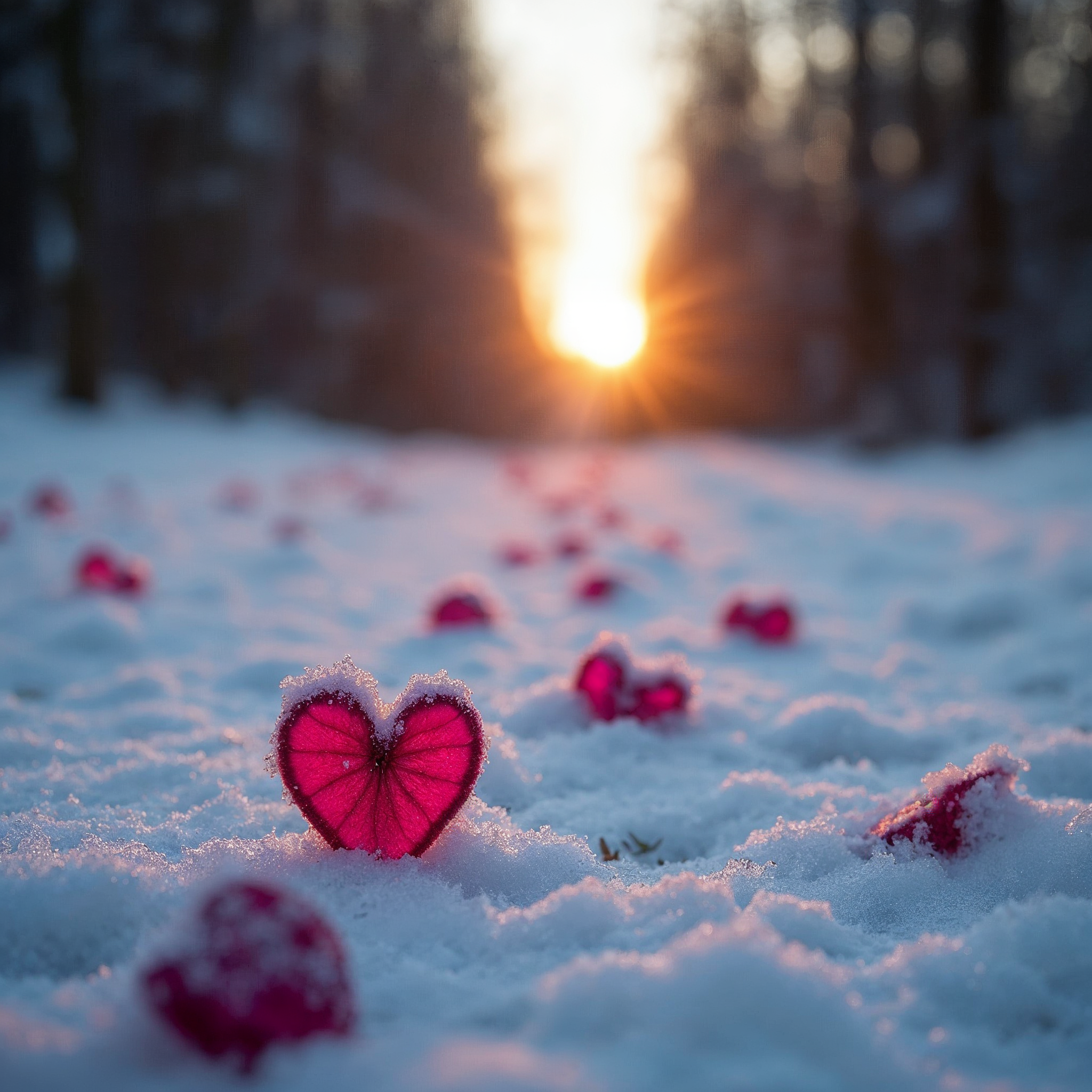 A large pink heart-shaped object sits on fresh snow in a winter forest, surrounded by smaller pink hearts scattered across the ground. In the background, a glowing sunset filters through tall snow-covered trees. The scene features a bokeh effect emphasizing the hearts against the blurred natural backdrop.