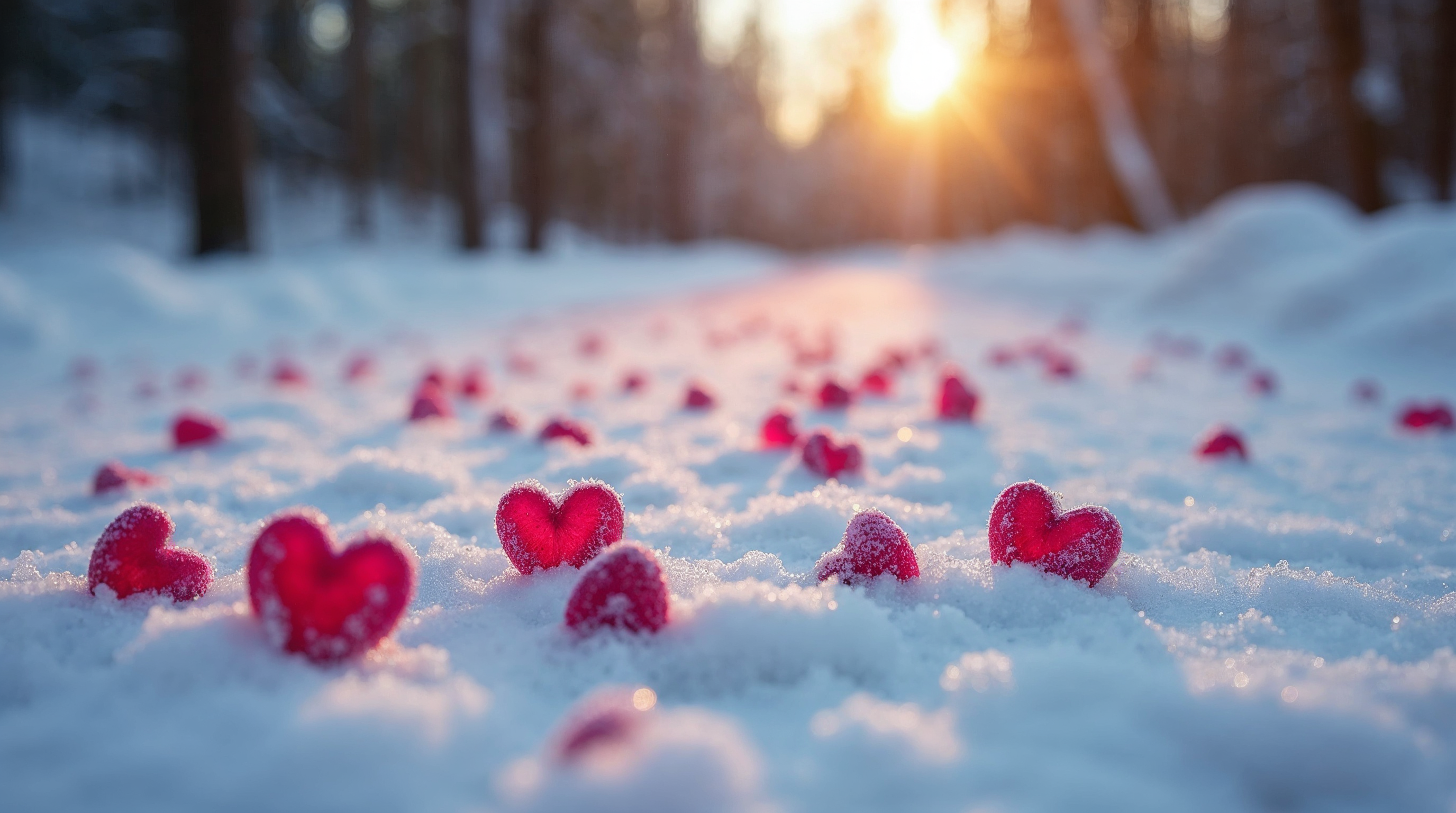 Numerous red hearts are scattered across a snowy path in a winter forest. Sunlight filters through the trees at sunset, casting a warm glow on the snow-covered ground. The scene features dense evergreen trees in the background with fresh snow blanketing everything.