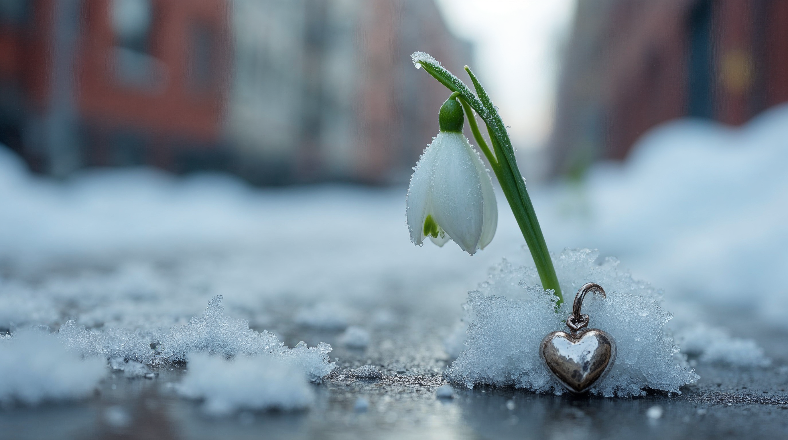 A delicate white snowdrop flower with green stem hangs from a small silver heart-shaped pendant. It rests on a snowy street surface in front of blurred red brick buildings during winter. Dew drops glisten on the flower petals and snow.