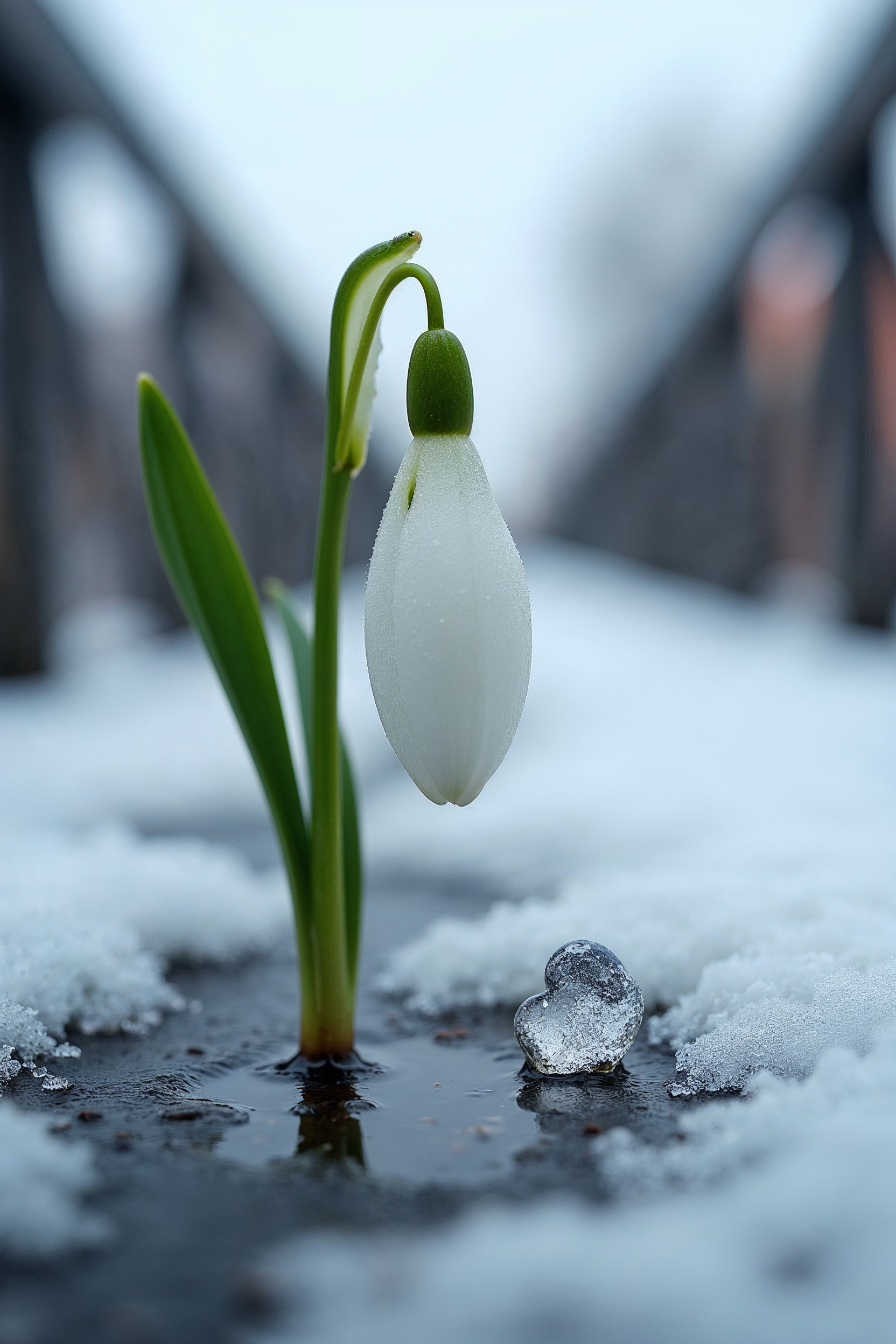 A delicate white snowdrop flower with green stem and bud hangs over a snowy surface near a metal bridge structure. Fresh green leaves emerge from the base, surrounded by scattered snow and a small ice crystal. The background shows a blurred bridge railing under a pale sky.