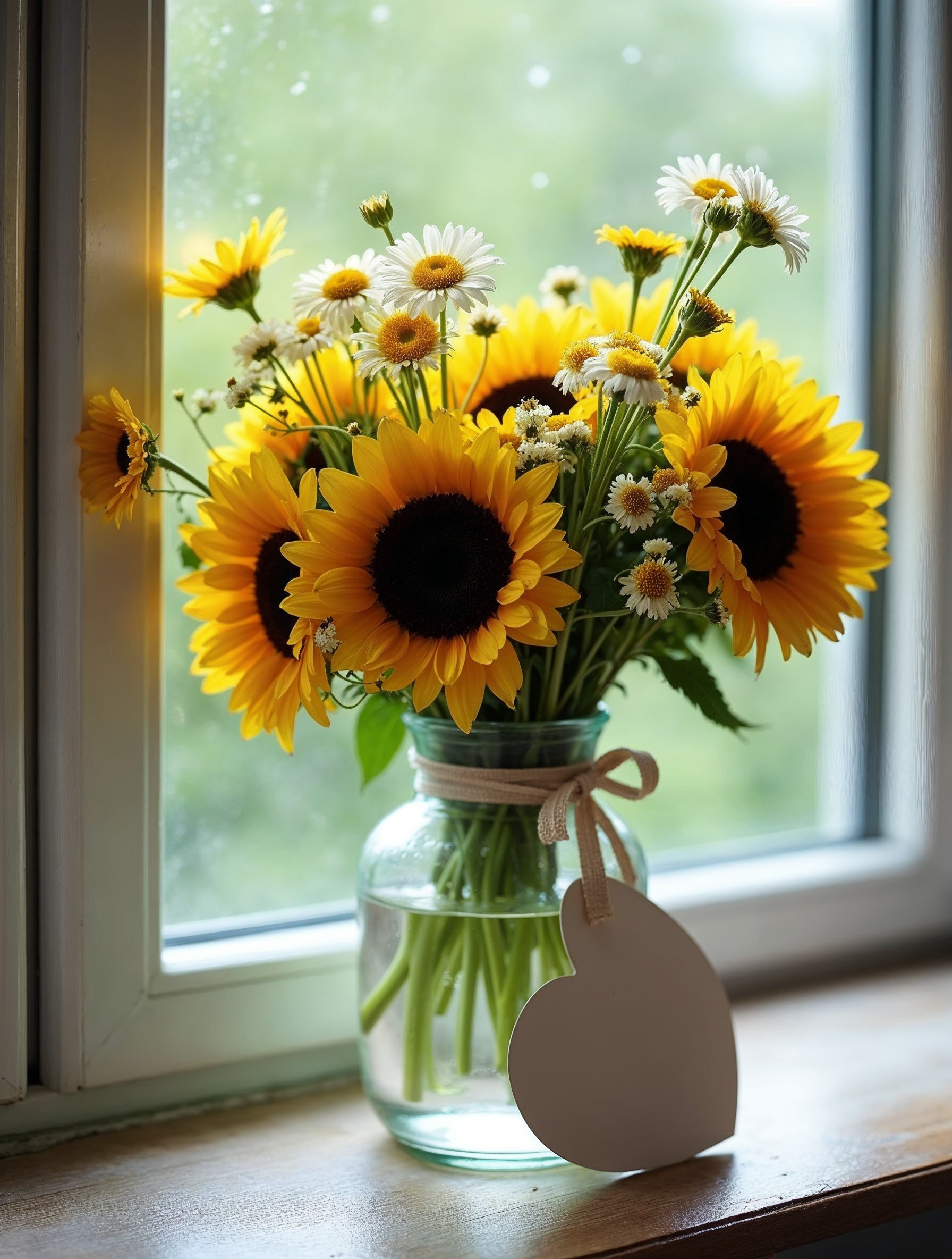 A bouquet of vibrant yellow sunflowers and white daisies is arranged in a clear glass jar on a wooden windowsill. The jar is tied with a beige ribbon and has a small white heart-shaped tag attached. Sunlight streams through the window, illuminating the flowers against a blurred green outdoor background.